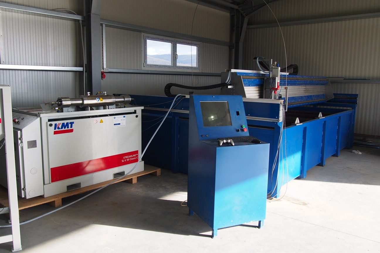 Presiunea necesara pentru debitare cu jet de apa se obtine cu ajutorul unei pompe de inalta presiune marca KMT. Dimensiunea standard a masinii CNC debitare cu jet de apa este 3 metri lungime si 2 latime, dar aceste date sunt foarte flexibile, au fost deja fabricate modele cu lungime de 7 metri si latime 2.5 metri.